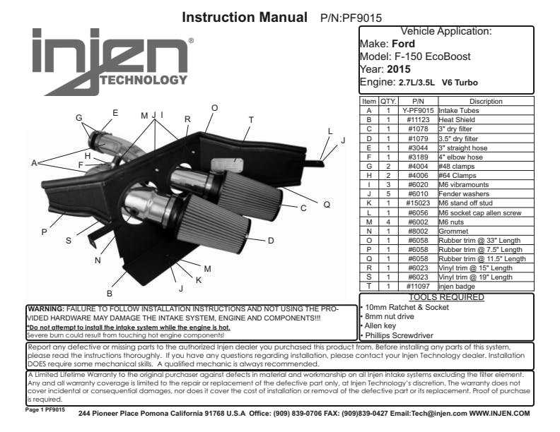 - Injen Technology Limited Lifetime Warranty